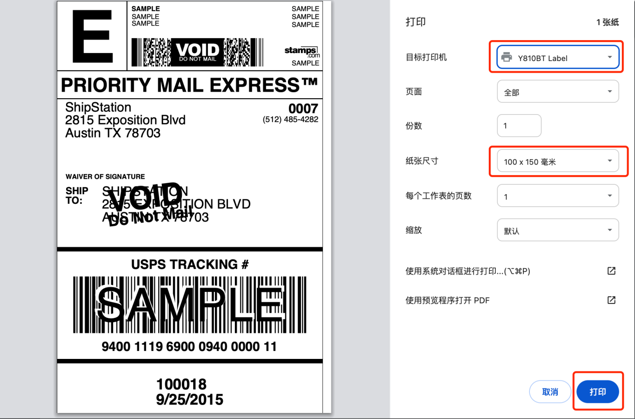 8. Select your Y810BT Label Printer from the destination dropdown menu. Here, you can also confirm the size and scale of the label. When you're ready, click 'Print', and your Y810BT Label Printer will print the label.