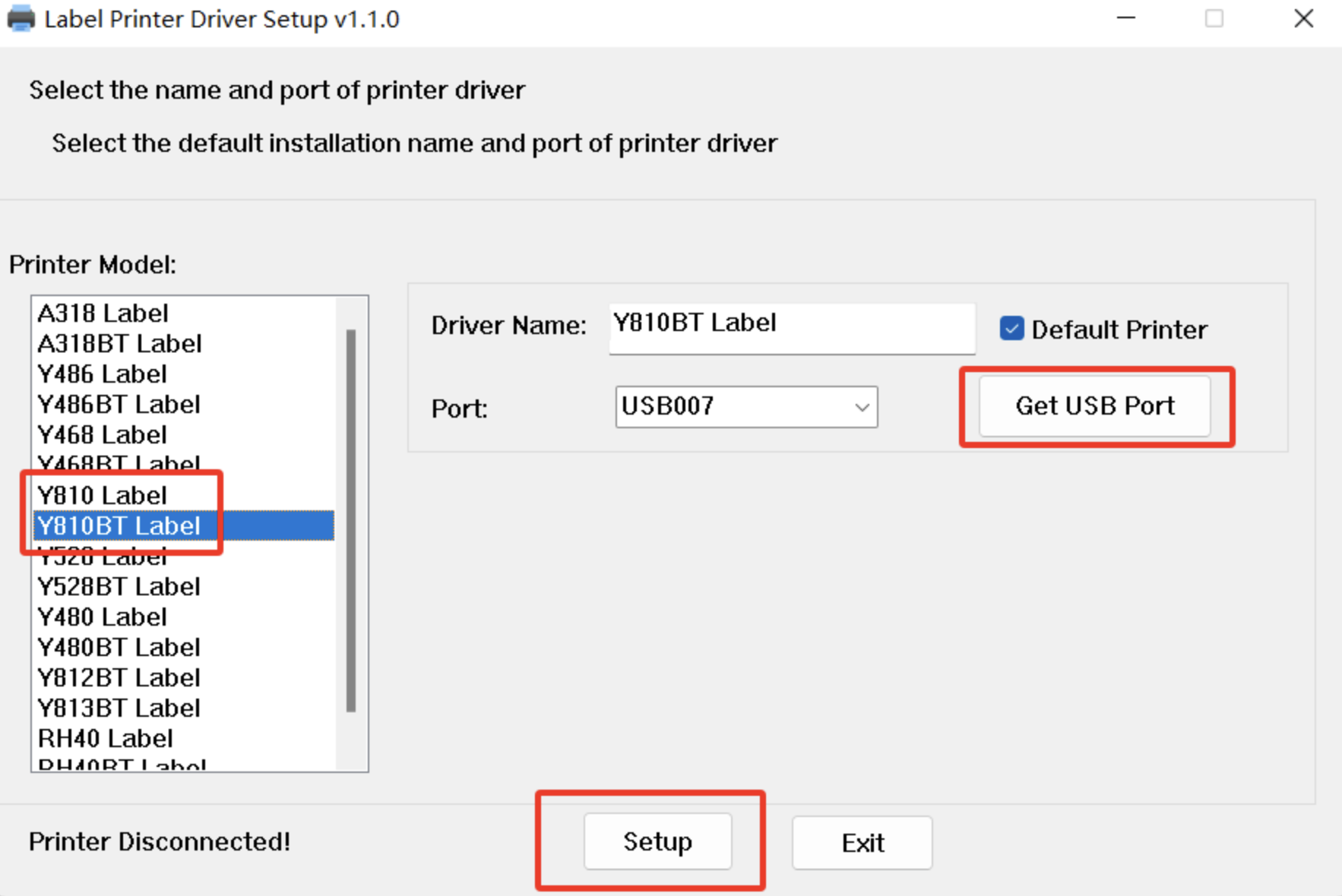 note:If you connect the printer and turn on, you can directly populate the Port option using "Get USB Port".