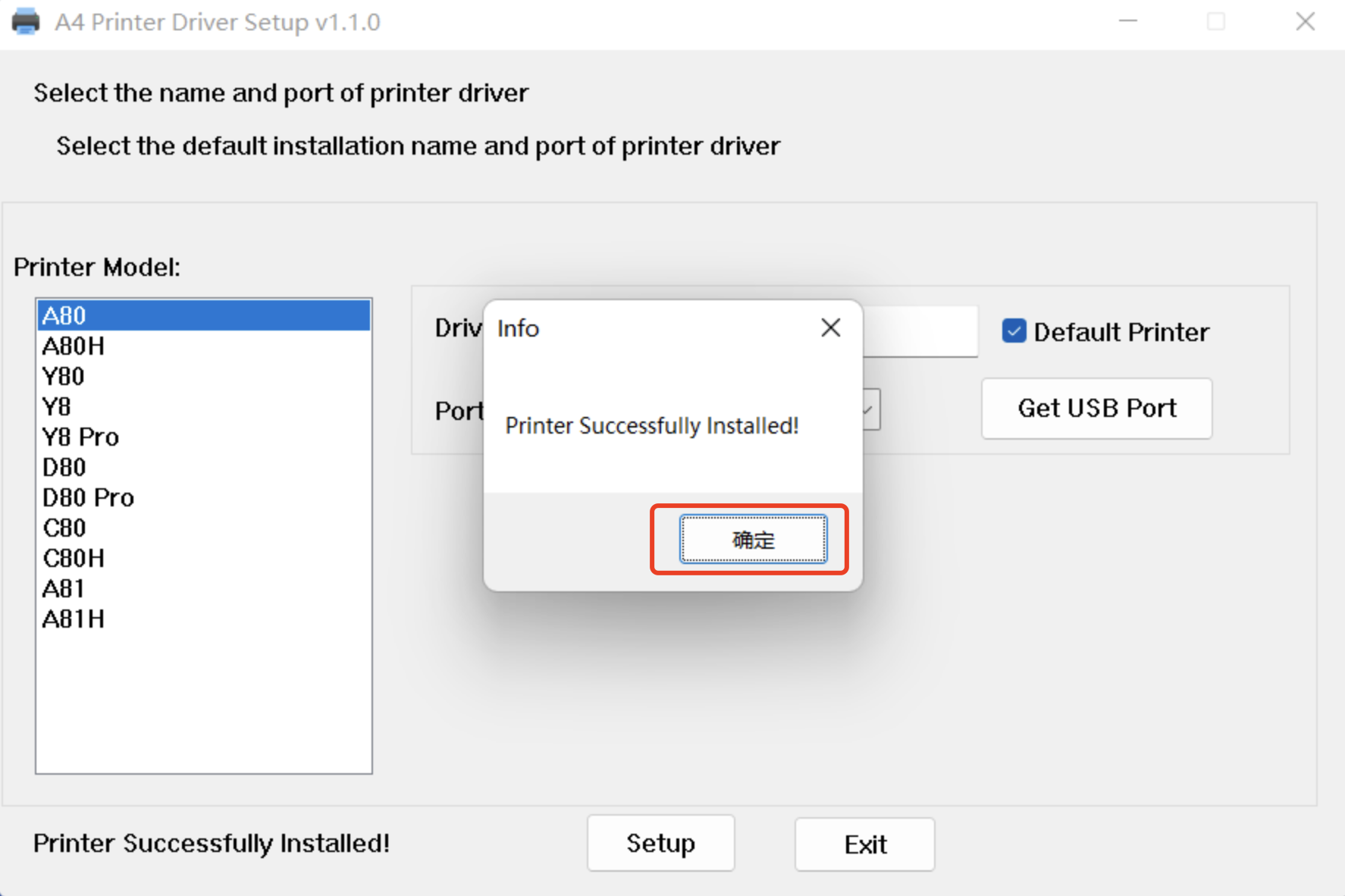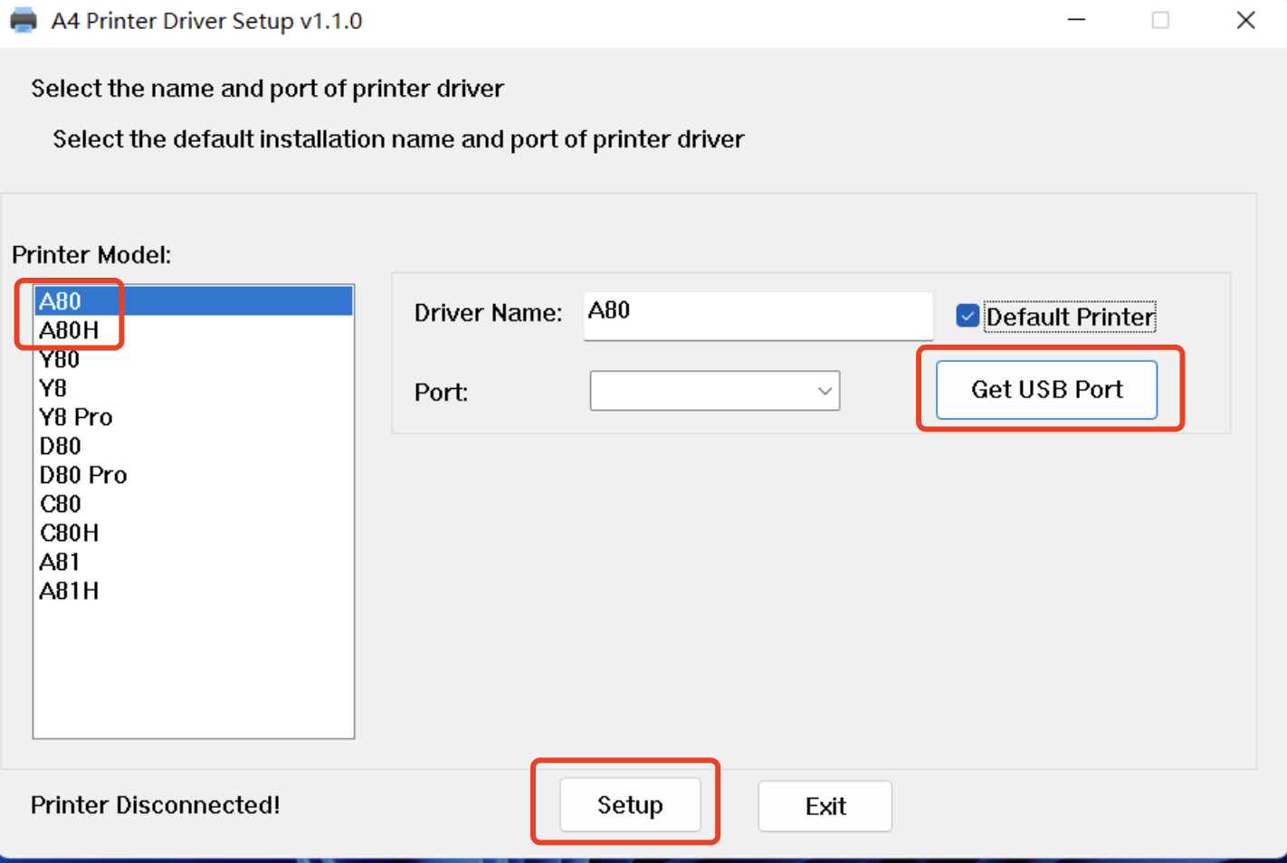 note:If you connect the printer and turn on, you can directly populate the Port option using "Get USB Port".